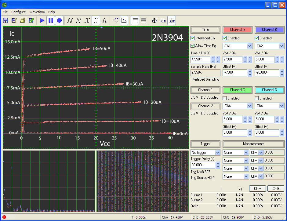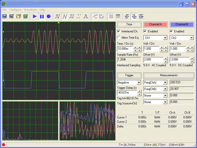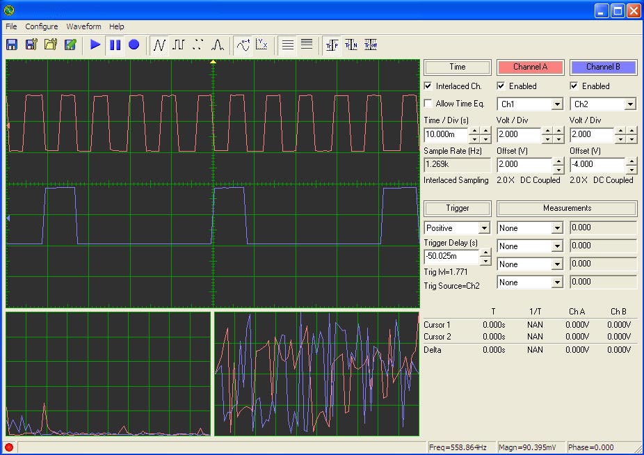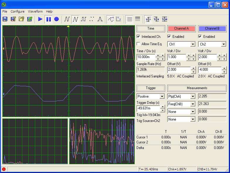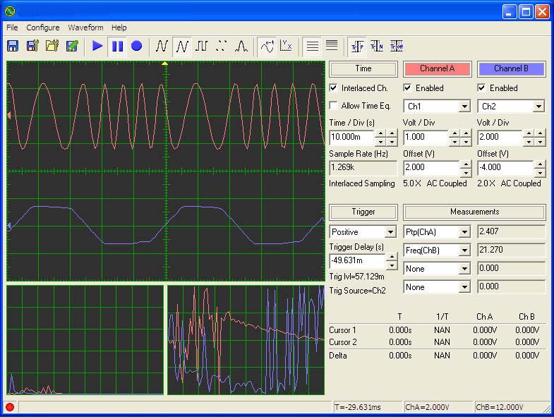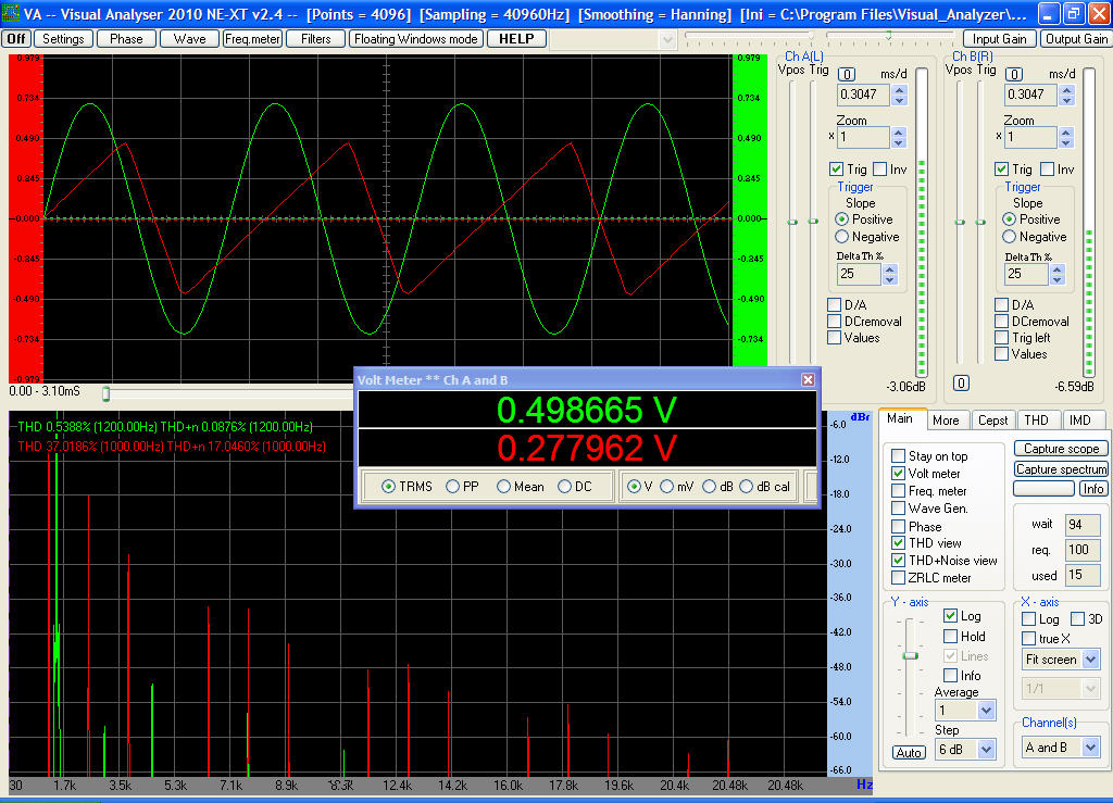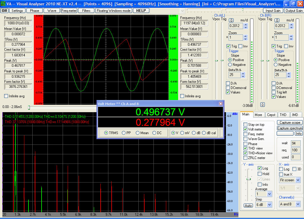 A surface mount implementation of the Visual Analyzer Oscilloscope/Spectrum Analyzer/Signal Generator. This is an audio frequency range piece of test equipment. While it only covers the audio frequency range (up to 48KHz; 96KHz sample rate), this instrument provides a wealth of information about the quality of audio signals. Along with being a dual channel oscilloscope, it also provides a dual channel spectrum analyzer and dual signal generators that are capable of producing a wide range of signals from sine waves, square waves, triangular waves, pulses, even custom waveforms, etc. Here is another screen shot of the Visual Analyzer in action. The Visual Analyzer software is free and available from Alfredo Accattatis' excellent website: Visual Analyzer Software |