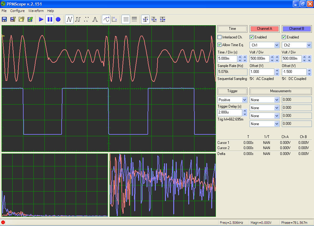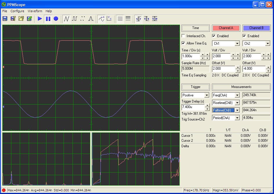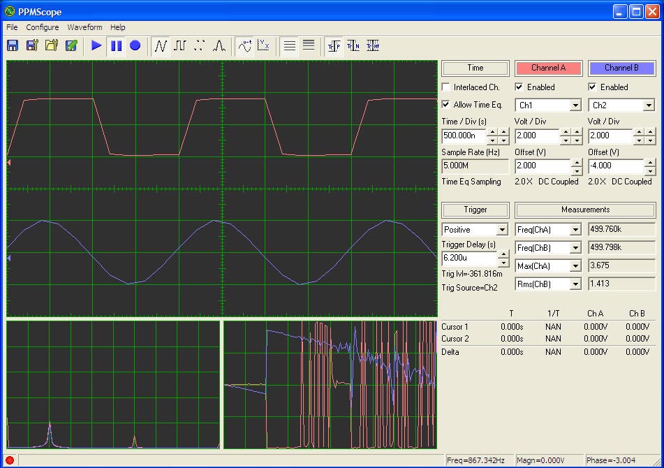 The DSOscope is a surface mount, and slightly modified/enhanced, implementation of Jonathan Weaver's famous PPMScope. The PPMScope is a 1.0 MHz sampling frequency, 5.0 MHz equivalent time, oscilloscope. Along with being a dual channel oscilloscope, the PPMscope also provides a spectrum analyzer function and multiple measurement capabilities for the displayed waveforms. The DSOscope version connects to the hosting PC via an internal USB interface. The internal USB interface uses the FT232RL serial to USB converter integrated circuit. The necessary driver code for the FT232RL is available from the FTDI website. The DSOscope is compatible with the PPMScope's PC software application code. Some of the feature enhancements of the DSOscope are: