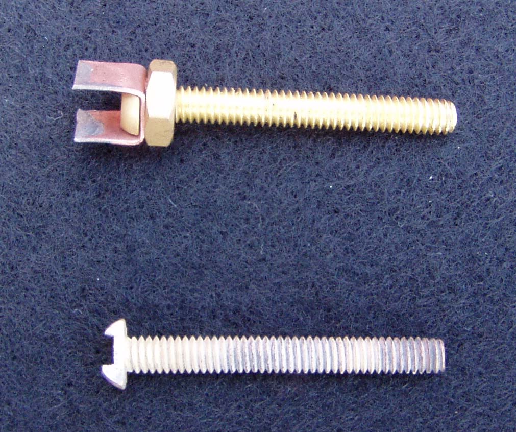 The photo on the left shows two SMT Desoldering Tips that have been made from 1.375 inch long by 8-32 pan head brass bolts. The SMT Desoldering Tip, shown at the top of the photo on the left, is used to unsolder SOIC-8 pin devices. It was created by filing the pan head slightly narrower and then adding a small U-shape bent piece of copper sheet stock that has a 5/32" hole drilled in the center of it. The U-shaped copper is attached with an 8-32 brass hex nut. Using this same technique, desoldering tips can be built for various SOIC sized devices. By adding a second piece of copper sheet stock, rotated by 90 degrees, it is possible to build desoldering tips for TQFP style devices. The SMT Desoldering Tip, shown at the bottom of the photo on the left, is used to unsolder 0805 SMT devices. It was created by filing a notch into the pan head of the brass bolt along with filing the pan head a bit narrower. Again, using this same notch filing technique, desoldering tips can be built for various size SMT devices such as 1210, 0805, 0603, and even the smaller 0402 devices. The SMT Desoldering Tip is installed, in place of a standard replaceable 5/32" soldering iron tip, in a cheap 25 watt soldering iron that uses plain, solid metal, soldering iron tips. When used, it is handy to have a small pair of tweezers, or a toothpick handy, to quickly remove the unsoldered device from the SMT Desoldering Tip as the desoldered device will likely "stick" to the desoldering tip as it is removed from the printed circuit board. Also, very lightly pre-tinning the SMT Desoldering Tip helps transfer heat to the to be removed device's pins. |